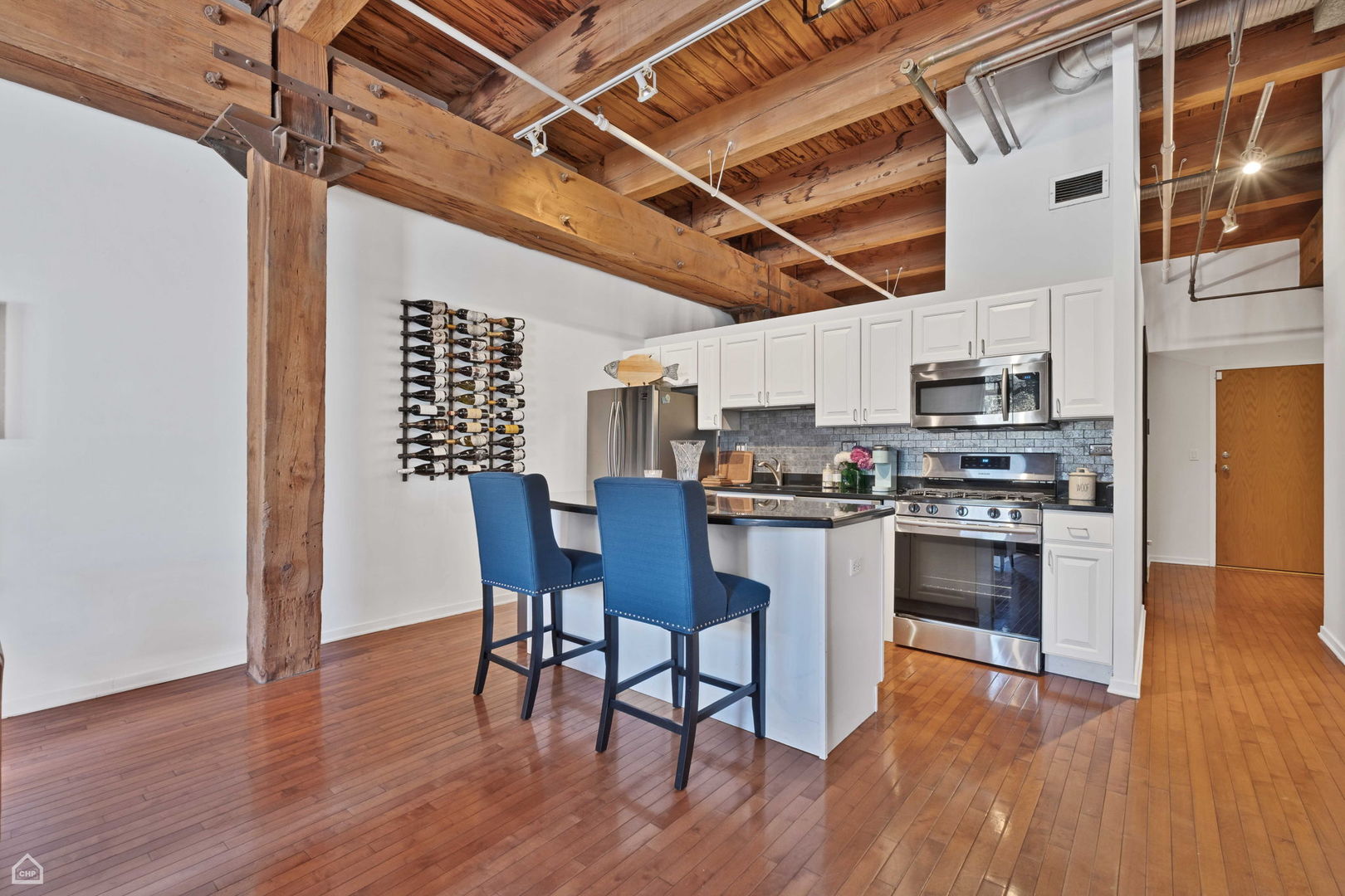 Welcome to this warm and stylish 2-bedroom, 1-bathroom condo in the highly sought-after Sexton Lofts, ideally located in the heart of River North. This spacious timber loft blends industrial charm with modern updates, featuring soaring ceilings, exposed brick, and rich hardwood floors throughout. The open-concept layout offers flexible space for living and dining, centered around a cozy fireplace with access to a private balcony perfect for grilling or unwinding outdoors. Kitchen shines with stainless steel appliances, granite countertops, and functional island for cook prep and additional seating. The primary suite includes organized walk in closet and plenty of room for beds of all size. Fully renovated primary bath sports dual sink vanity, oversized marble tile shower and is conveniently jack-and-jill to both the primary bedroom and foyer for easy of privacy and accessibility for guests. The Sexton offers full-service amenities including 24-hour door staff, an on-site manager, fitness center, package receiving room, dry cleaners, bike room, and a spacious storage locker. Heated garage parking is available for additional price (30K). This pet-friendly building (2 pets max) is just one block from East Bank Club and the Merchandise Mart, with effortless access to the Loop, EL trains, and major expressways-making this an unbeatable location for work and play.